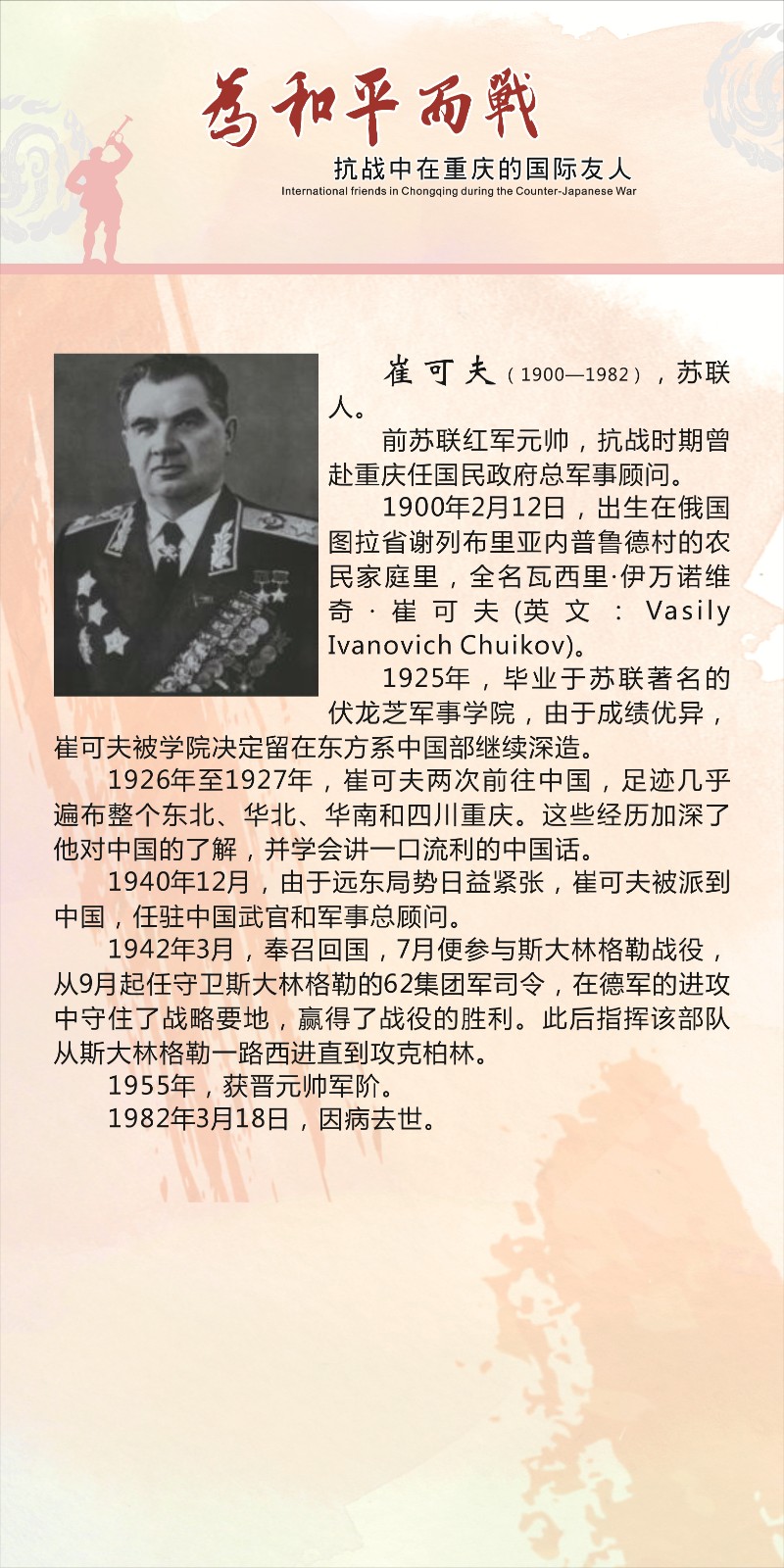 展览通过140余张珍贵的历史照片,展现了史迪威、陈纳德、谢伟思、崔可夫、库里申科等曾为中国抗日战争做出卓越贡献的国际友人,他们在重庆工作生活的情况。彰显不同社会制度国家、不同肤色人民之间紧密团结对战胜法西斯、推动历史进步的重要意义,同时宣传抗战史,唤起每个善良的人对和平的坚守。